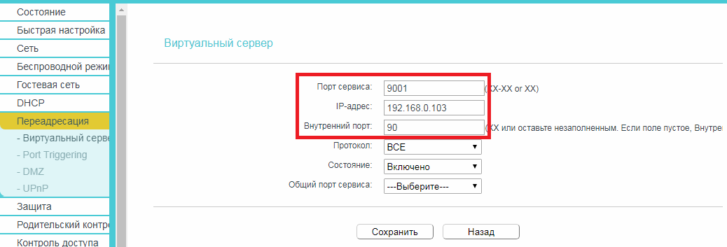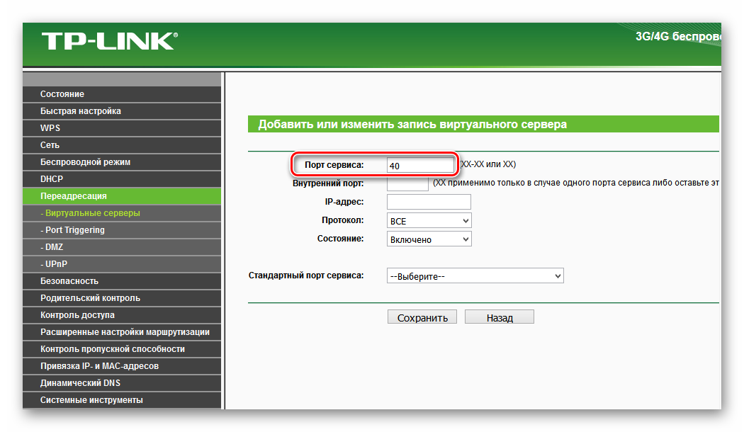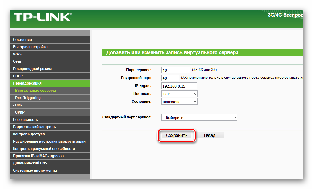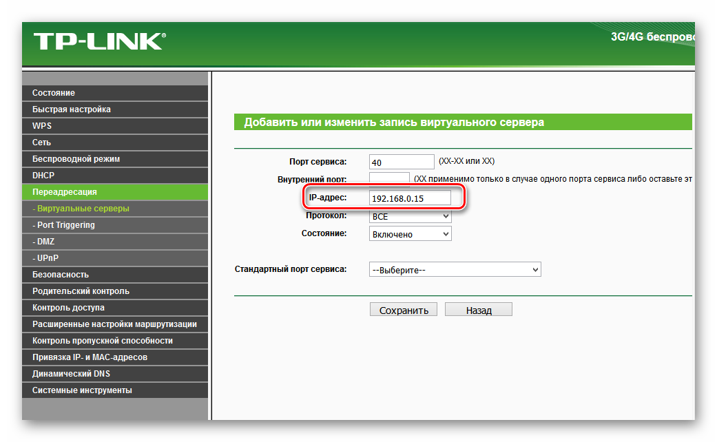 Введите порт сервиса, который вы хотите открыть, и IP-адрес вашего устройства, для которого вы хотите открыть порт; выберите протокол TCP, UDP или ВСЕ; Измените статус на Включено.