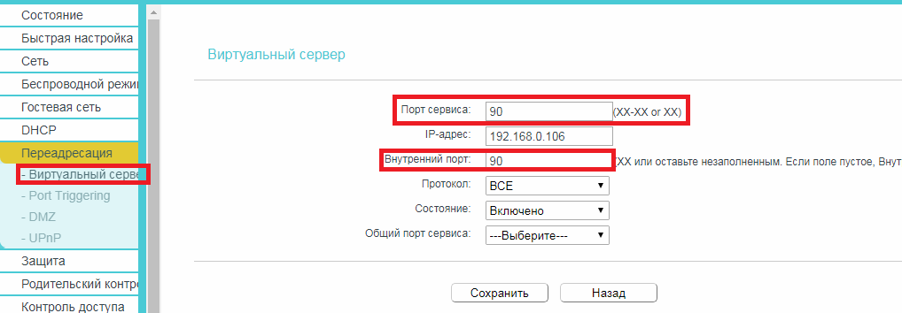 Например, если вы хотите открыть порт 90 только для одного из устройств 192.168.1.106, вы можете настроить его, как показано ниже: