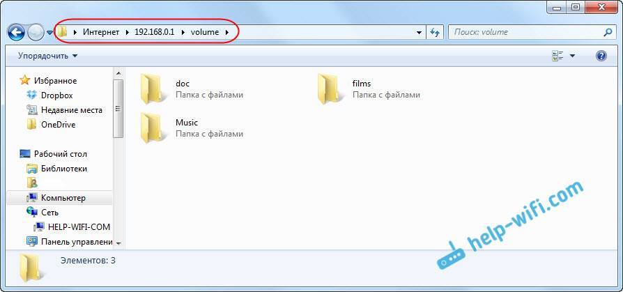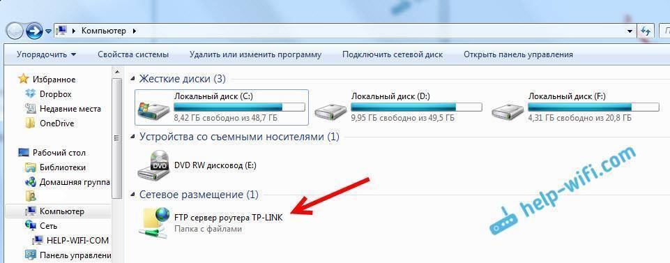 Просто открываем проводник “Мой компьютер”, или “Этот компьютер” (Windows 10), и переходим по адресу, который указан в настройках роутера. У меня это “ftp://192.168.0.1”. Если у вас IP-адрес роутера 192.168.1.1, то адрес будет “ftp://192.168.1.1”.