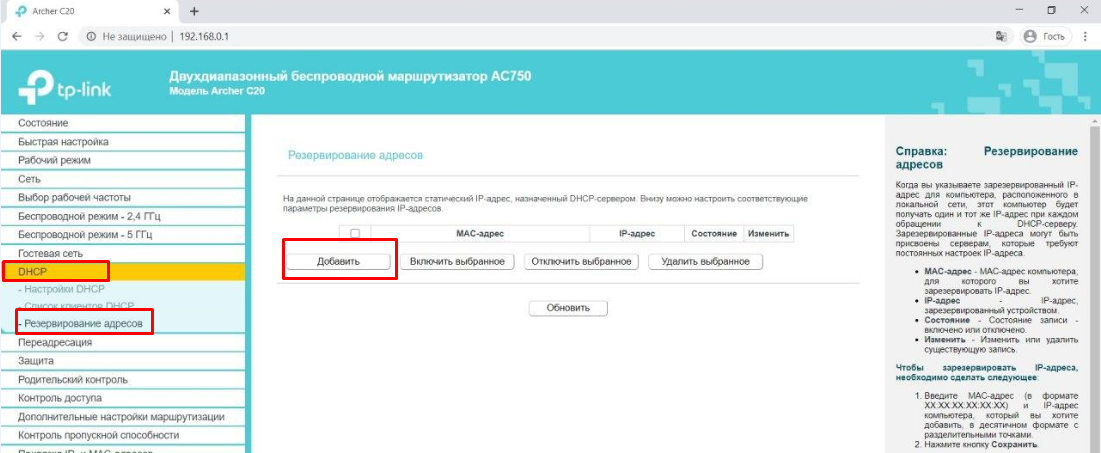 4. После чего перейдите в подраздел «Резервирование адресов» и нажмите кнопку «Добавить».