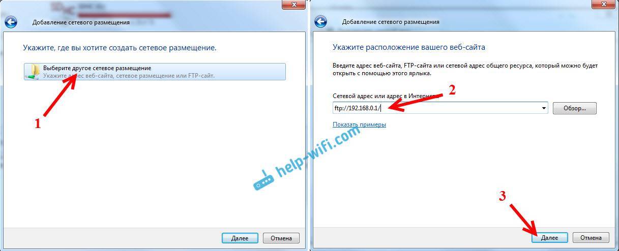 Два раза нажимаем на “Выберите другое сетевое размещение”, указываем адрес нашего сервера, и нажимаем “Далее”.