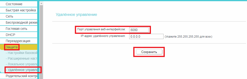 Перейдите в раздел Защита – Удаленное управление, а затем измените Порт управления веб-интерфейсом на другие порты, такие как 8080 и нажмите Сохранить.