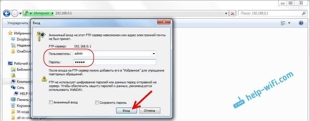 Дальше появится запрос имени пользователя и пароля. Я об этом писал выше. Здесь нужно указать те же данные, которые вы используете для входа в настройки роутера TP-LINK (стандартные admin и admin). Можете поставить галочку “Сохранить пароль”, и нажмите “Вход”.