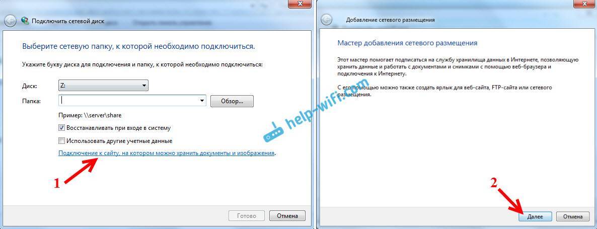 Появится окно, в котором нажимаем на “Подключение к сайту, на котором можно хранить документы и изображения”. И в следующем окне нажимаем “Далее”.