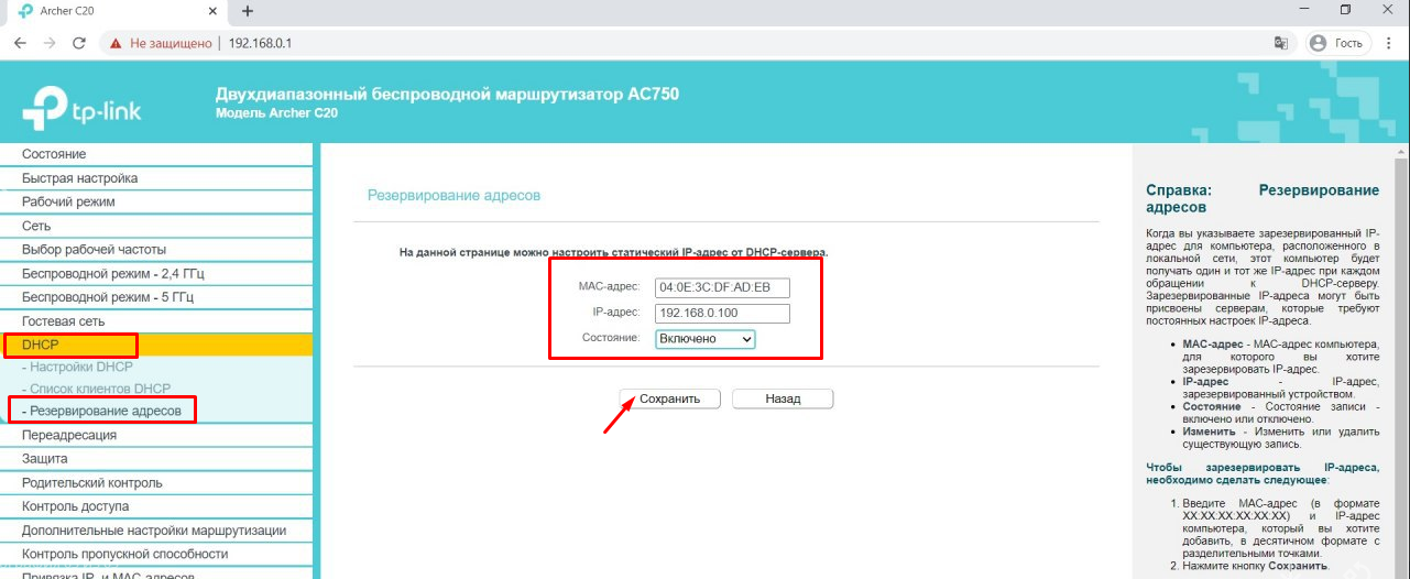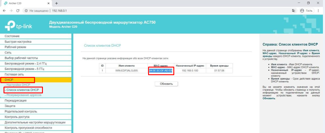3. После того, как Вы попали в настройки роутера, Вам необходимо в меню слева зайти в раздел «DHCP», выбрать подраздел «Список клиентов DHCP». После этого среди списка устройств, подключенных к роутеру найдите то, на которое вы хотели бы перенаправить порт, скопируйте его MAC-адрес и запомните IP-адрес.