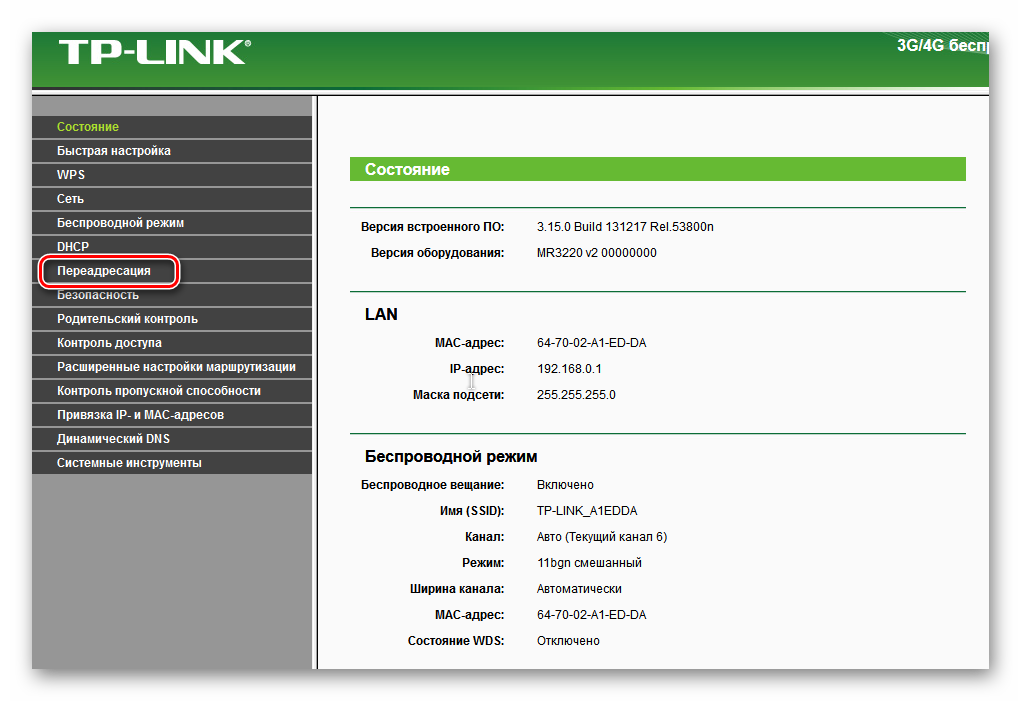 В открывшемся веб-интерфейсе маршрутизатора в левой колонке находим параметр «Переадресация».