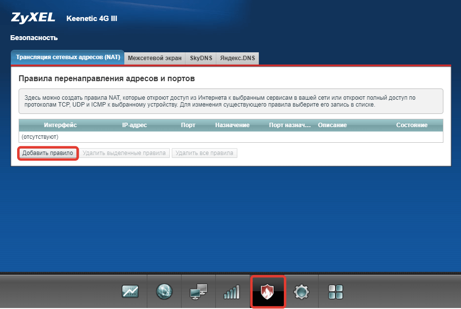 Чтобы открыть порт на Keenetic — нажмите кнопку «Добавить правило».