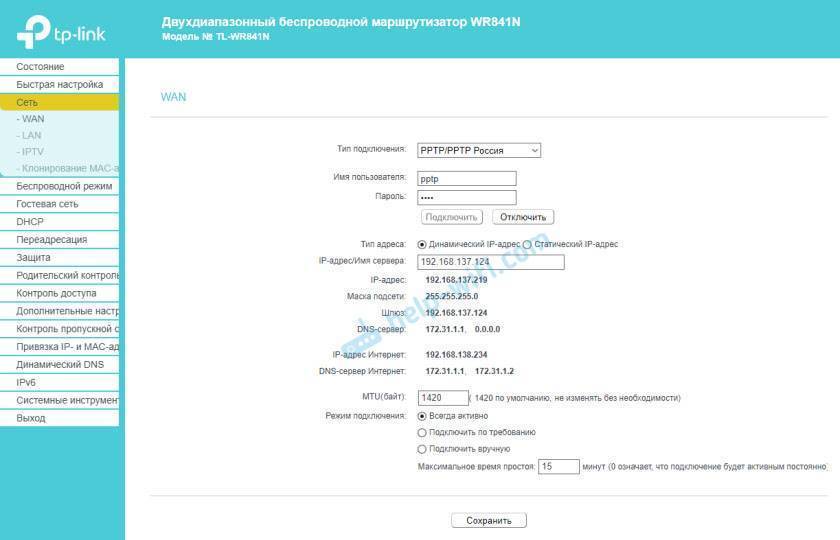 В веб-интерфейсе роутера нужно найти раздел с настройками подключения к интернету. Чаще всего он называется “Интернет”, или “WAN”. И там нужно правильно задать параметры, которые выдает вам интернет-провайдер. Выбрать тип подключения и указать необходимые параметры, если это необходимо. Все настройки вы можете уточнить у поддержки интернет-провайдера, или посмотреть в договоре о подключении к интернету. Так же необходимо выяснить, делает ли провайдер привязку по MAC-адресу (но это актуально в основном для подключения через “Динамический IP”). Вот так, например, выглядят эти настройки на роутере TP-Link (со старой прошивкой):