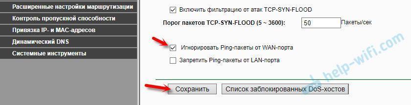Я думаю, есть смысл еще попробовать включить на этой же странице функцию: “Игнорировать Ping-пакеты от WAN-порта”.