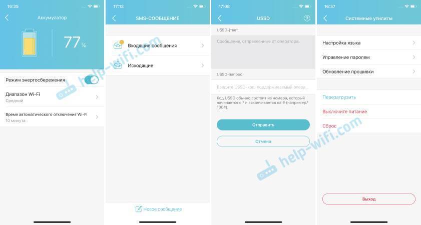 Дальше у нас идет раздел с настройками аккумулятора (можно посмотреть уровень заряда, включить режим энергосбережения, сменить диапазон Wi-Fi и настроить отключение Wi-Fi сети, когда роутер не используется). Есть так же отдельная страница, где можно просматривать/отправлять SMS-сообщения и USSD команды. Например, для проверки состояния счета, бонусов, смены тарифных планов.