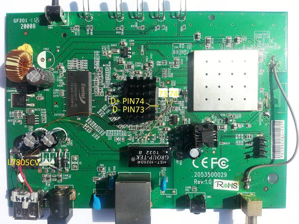 For the v1 USB mod you need to solder wires to the following resistors: R100 (Pin 73) and R101 (Pin 74).