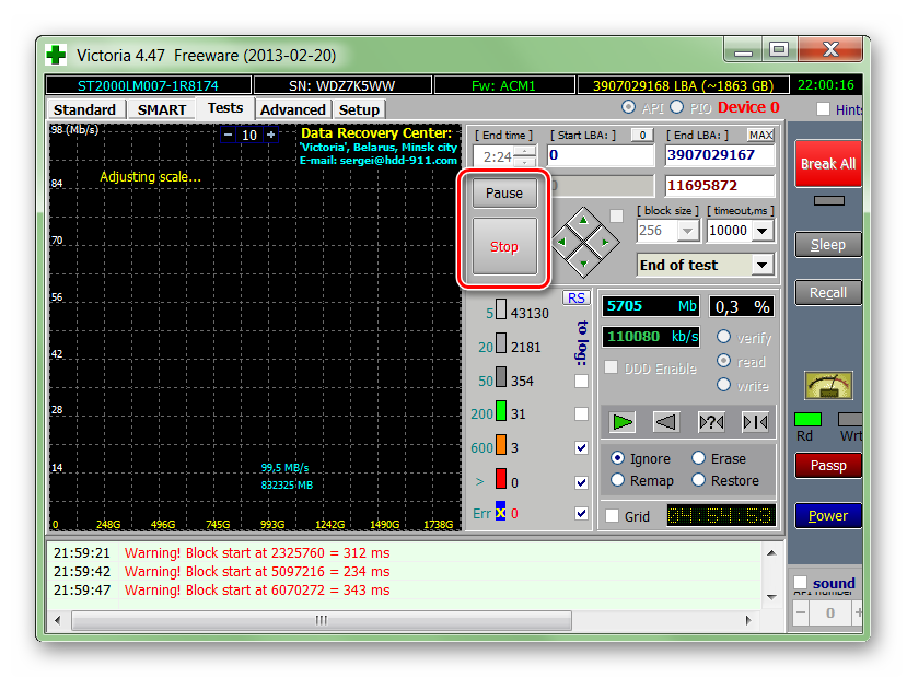 При необходимости работу программы можно приостановить. Для этого нажмите на кнопку «Pause» или «Stop», чтобы окончательно остановить тест.