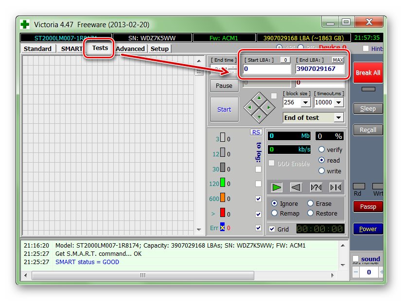 - Перейдите на вкладку «Tests» и выберите желаемый участок тестируемой области. Для этого используйте параметры «Start LBA» и «End LBA». По умолчанию будет проведен анализ всего HDD.