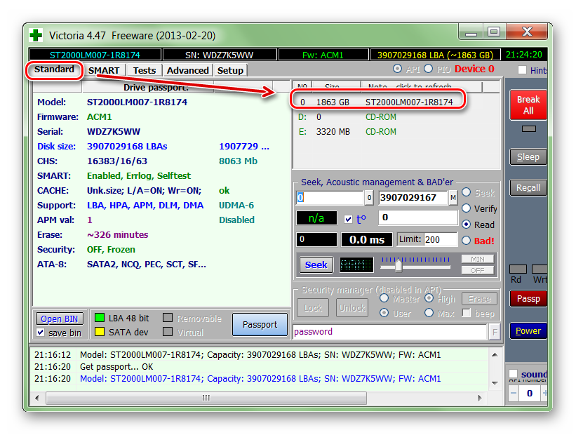«Инфо» (ранее «Standard») – первая вкладка программы Victoria HDD. В левом окне показана информация о жестком диске: модель, серийный номер, объем накопителя информации, размер кэша, скорость работы, используемый интерфейс (SATA II или III).