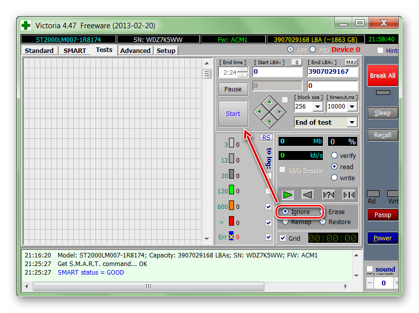 - Ignore — этот параметр при сканировании будет пропускать все битые (BAD) сектора, этот параметр стоит применить, если вы просто хотите просканировать и понять в каком состоянии находится поверхность вашего жесткого диска.