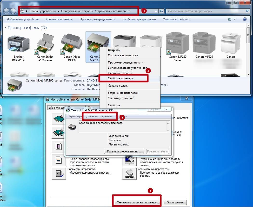 Если драйверов нет, загрузите их с сайта, введя название модели печатающего устройства. Далее инсталлируйте софт, зайдите в настройки: «Панель управления» – «Принтеры и сканеры». Там выберете модель, нажмите на «Свойства». Отобразится монитор состояния Canon.
