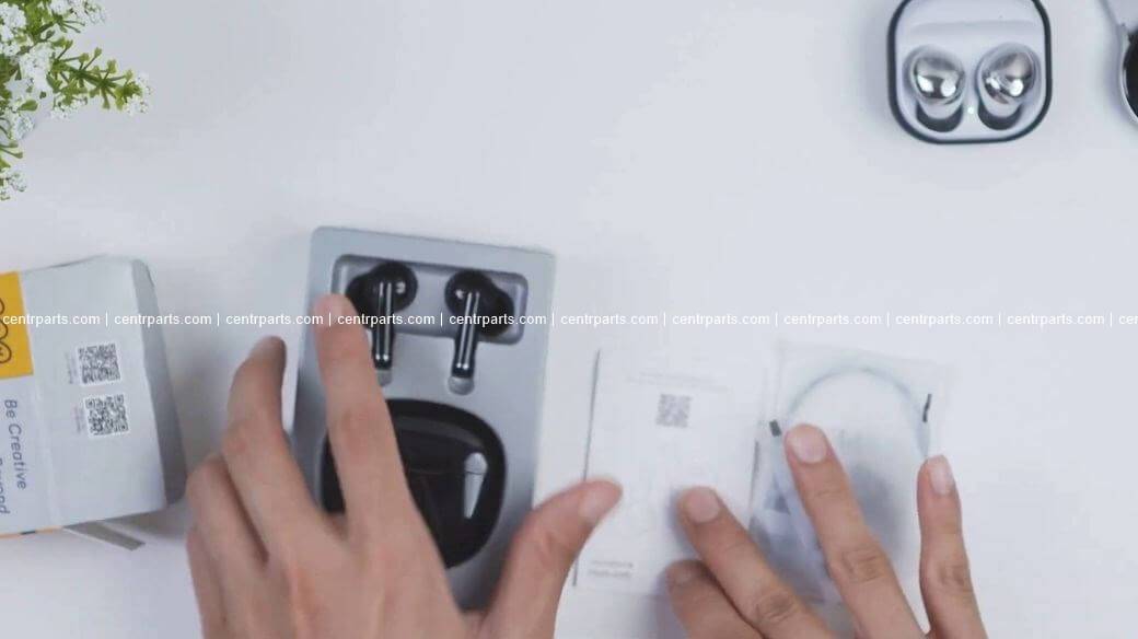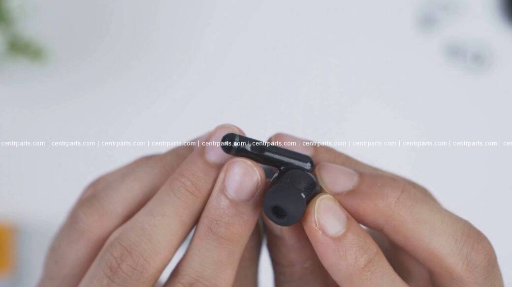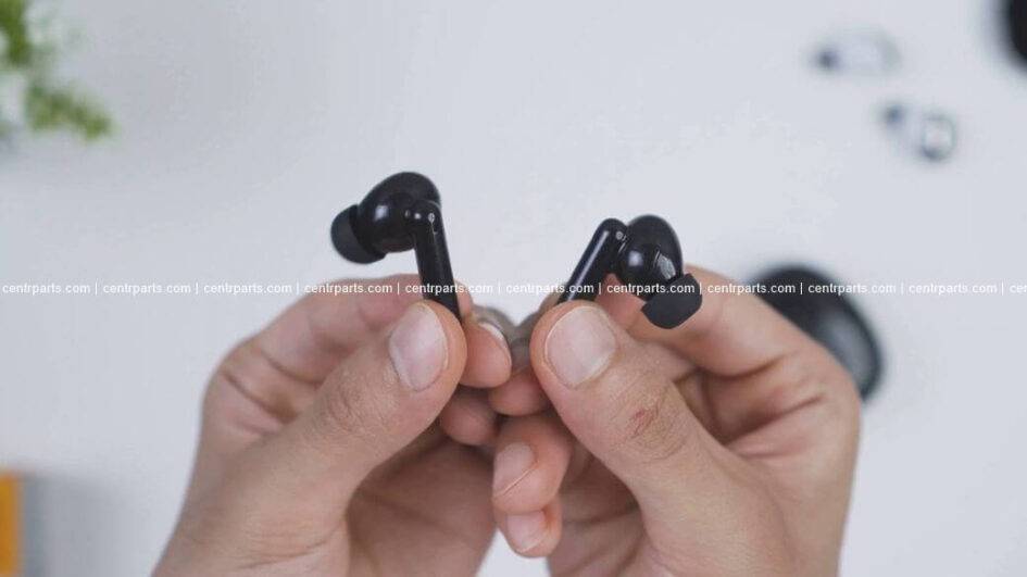 Внутри кейса расположены два наушника. На их ножках находятся контакты, от которых они заряжаются. Там же расположены основные микрофоны. Форма наушников напоминает каплю на ножке, все углы, так же как и у футляра, скругленные. На внутренней стороне ножки есть обозначение R для правого наушника и L для левого. С противоположной стороны находится сенсорная область. Амбушюры однотонные в цвет наушников, они сделаны из силикона.