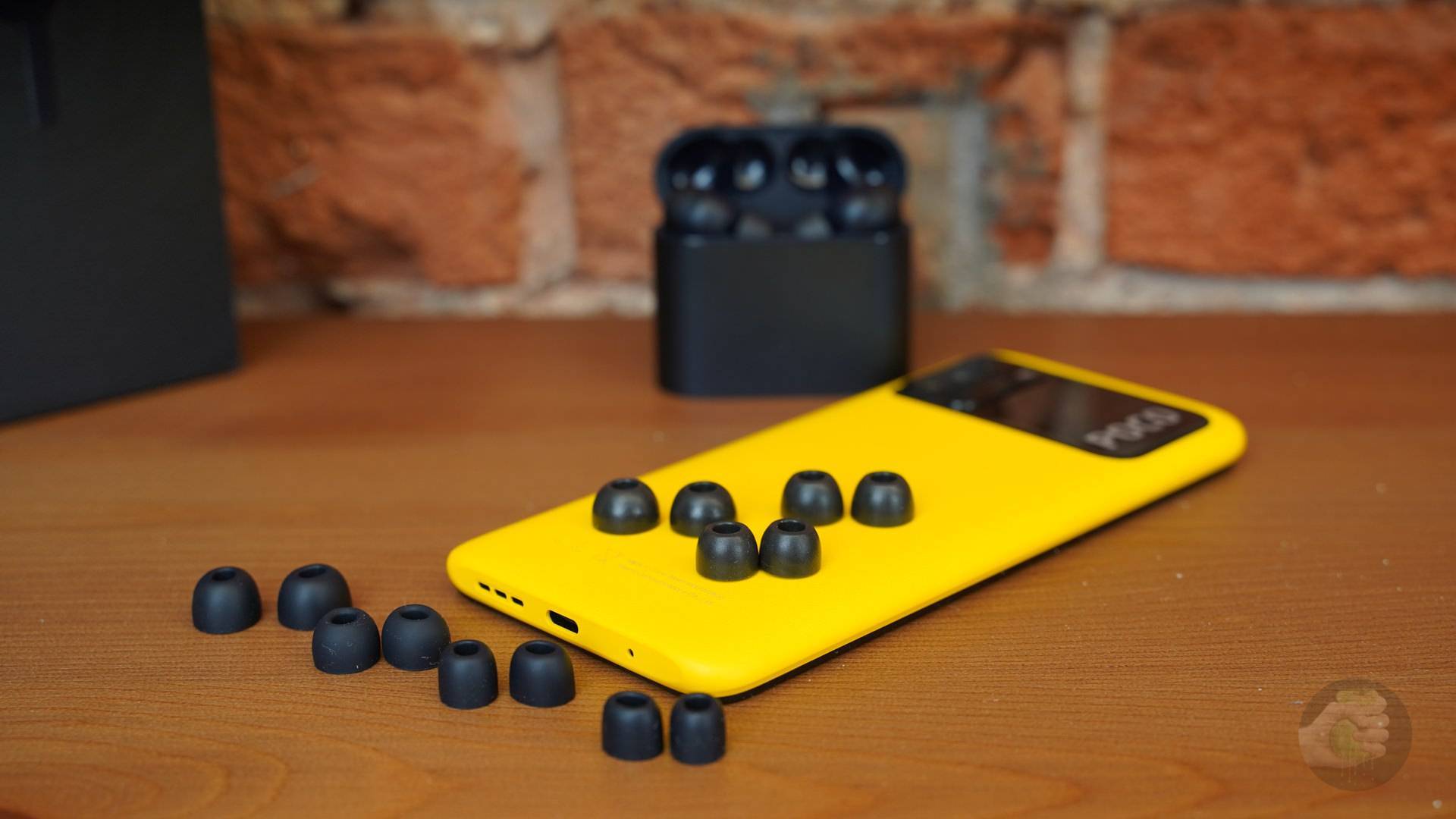 Комплект поставки такой: кабель USB Type-C для зарядки, сменные насадки разных размеров. Причём получаем не только привычные силиконовые, но и пенные! Особенно советую попробовать пенные, с ними и шумоизоляция лучше, и звучание меняется в лучшую сторону.