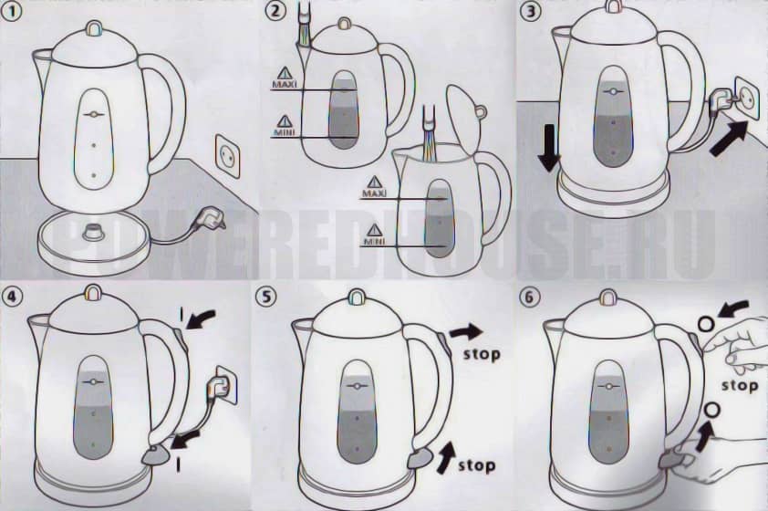В более обобщенном виде, принцип работы электрочайника заключается в последовательном осуществлении следующих действий: