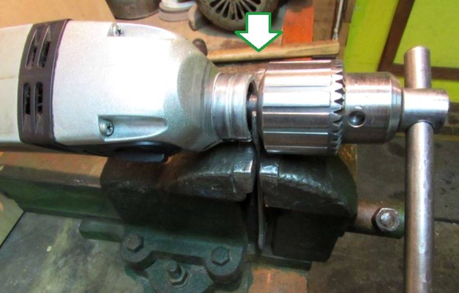 В дрелях невысокой мощности шпиндель имеет наружную правую резьбу на конце, на которую накручивается патрон, и отверстие в центре с левой резьбой, куда закручивается шунтирующий болт. Этот болт имеет головку под четырёхгранную или крестовую отвертку, его необходимо выкрутить. Затем, заблокировав гвоздём крыльчатку двигателя, попытаться резким, но умеренной силы движением сорвать патрон против часовой стрелки. Если резьба закипела, дрель придётся разобрать, чтобы зажать шпиндель вместе с ведомой шестерней в тисках.