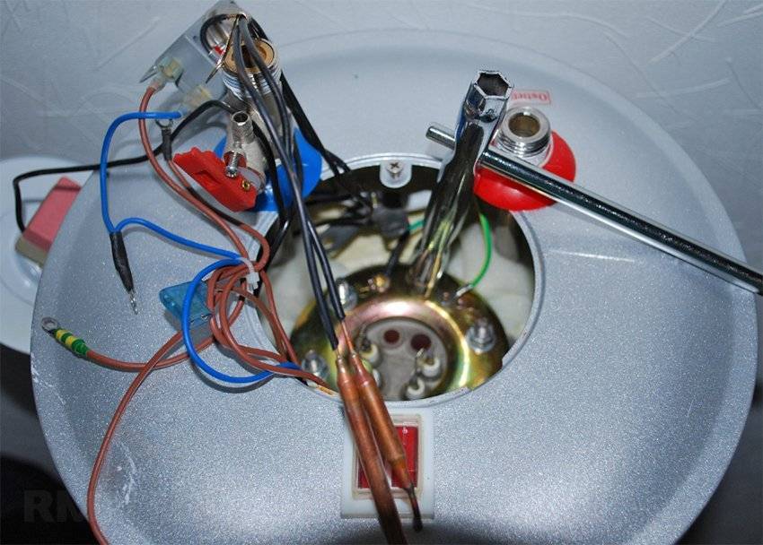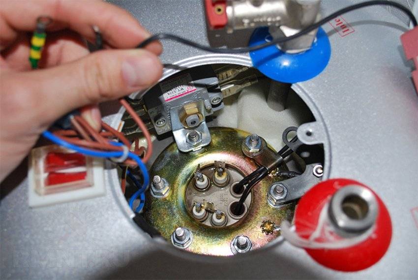 Внутри блока находится электрическая разводка: красный и синий провод, оконцованные клеммами, снимаем с контактов ТЭН’а, желто-зеленый отсоединяем, скрутив гайку заземления на корпус. Следом за ними отключаем провода термостата и регулятора температуры, снимаем тепловой проводник, который иногда выполнен в виде обычного однопроволочного медного провода.