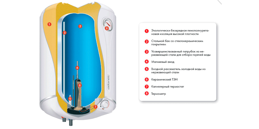 - при падении температуры воды в баке термостат включает ТЭН, а при достижении максимальной – выключает.