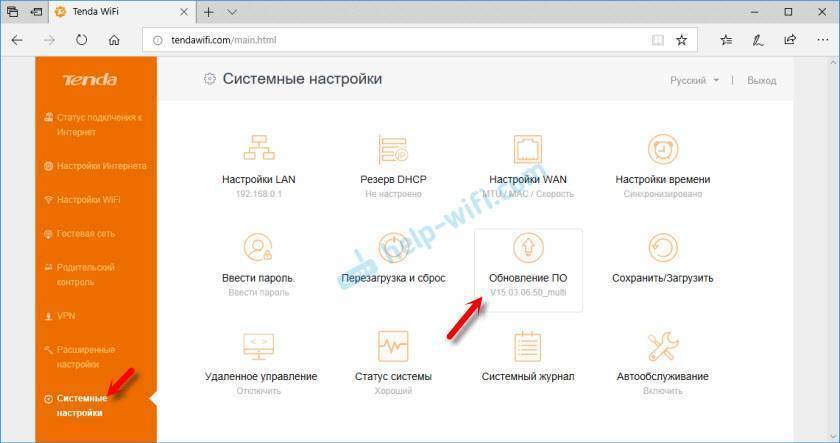 Выполнить обновление прошивки маршрутизатора Tenda AC6 можно в разделе “Системные настройки” – “Обновление ПО”. Там же будет указана текущая версия прошивки.