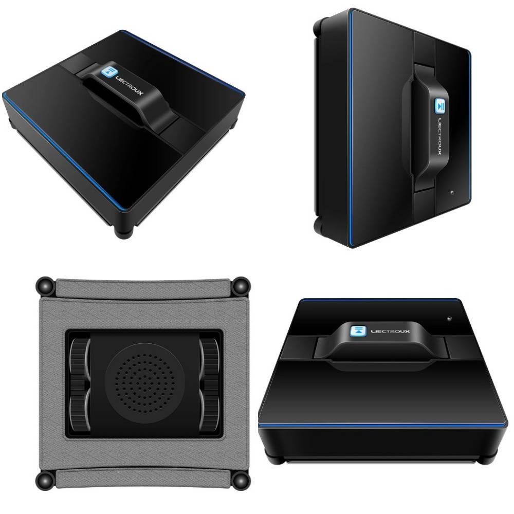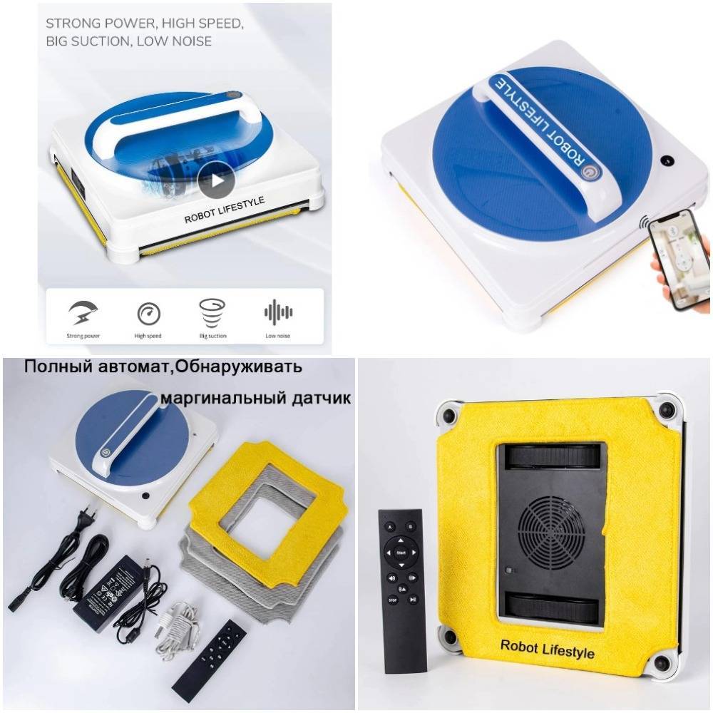 Стеклоочиститель работает в 4-х режимах. Он умеет самостоятельно определять площадь чистки, анализируя форму, размеры и вид поверхности. По желанию можно выбрать один из трех имеющихся маршрутов. При отключении электричества, устройство удерживается на поверхности за счет аккумулятора 15 минут, что на 5 минут меньше, чем у аналогов. Также в комплекте идет пульт ДУ, страховочный трос, сменные насадки, сетевой шнур, удлинитель. Имеется звуковое оповещение, дающее знать владельцу, что работа окончена.