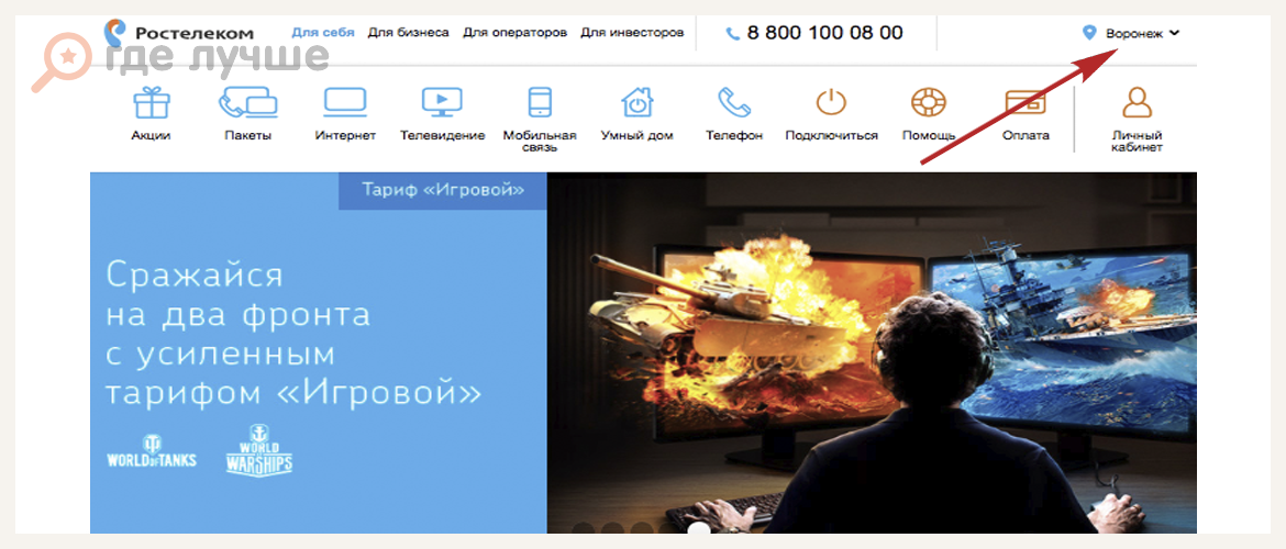 Зайдите на главную страницу официального сайта rt.ru. Если на вашем компьютере включена функция определения местоположения по геопозиции, система сразу перенаправит вас на страницу компании в вашем городе. Если функция отключена, необходимо указать город самостоятельно. Для этого в правом верхнем углу нажмите на город и из списка выберите свою область и населенный пункт.