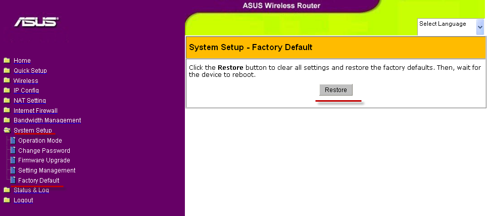 В случае, если необходимо восстановить заводские настройки, то нужно нажать: сначала System Setup, потом Factory Default. В открывшемся окне нажать Restore.