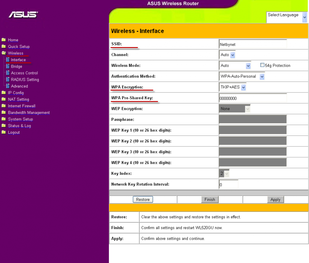 SSID: yourNetworkName Wireless Mode: Auto (галочка на 54g Protection почему-то не установлена) Auth. mode: WPA-PSK/WPA2-PSK WPA/WPA2-Encryption: TKIP … Network Key Rotation Interval: 0 - Меню Wireless -> Advanced: