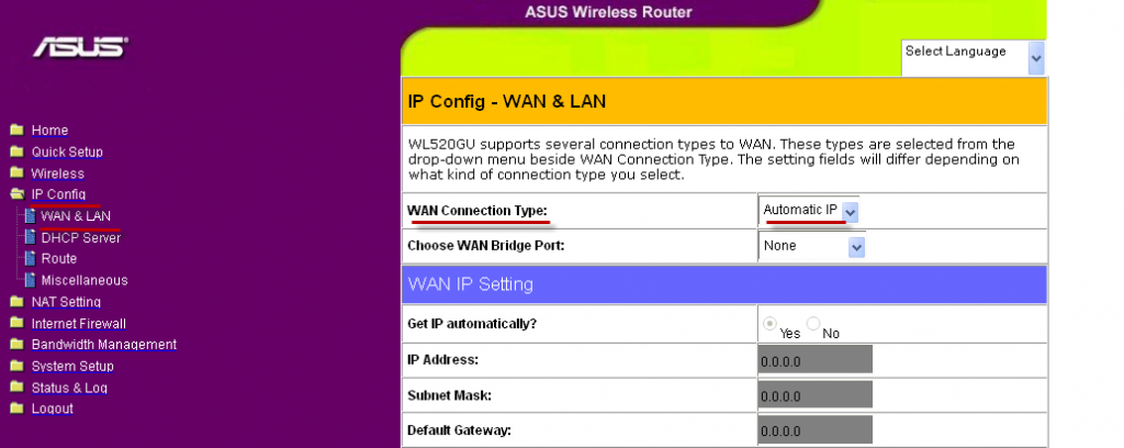 - В разделе WAN Connection Type выбираем тип соединения, которое использует ваш интернет провайдер. Например, в WAN Connection Type выбираем Automatic IP. Если провайдер использует Dynamic IP, то есть динамический IP.