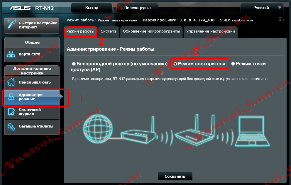 Тут тоже не всё просто. Вы можете найти две одинаковые модели с разным индексом (например, RT-N12 C1 и RT-N12 D1), из которых один умеет работать в режиме ретранслятора, а другой — нет.