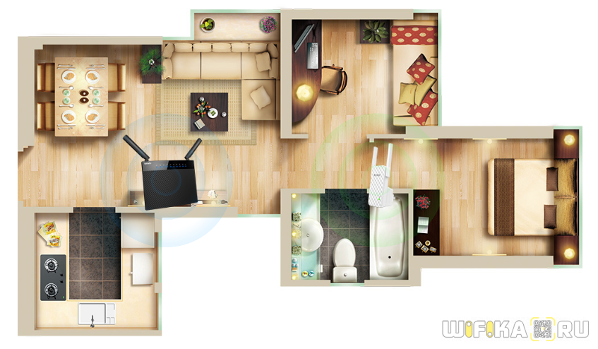 Самая распространенная — при неправильной изначальной установке основного роутера. Например, вам повезло и от бабушки осталась большая пятикомнатная квартира в сталинской высотке. Вы решили организовать в ней беспроводную сеть, но установили маршрутизатор не по «географическому» центру квартиры. А допустим, своей комнате со стационарным компьютером (ибо, он подключен по кабелю, а тянуть его через всю квартиру не охота). Либо в прихожей сразу над входной дверью, как это любят сегодня делать провайдеры интернета. Тогда получается, что до дальней комнаты wifi недостает и выйти в интернет с ноутбука или смартфона не представляется возможным.