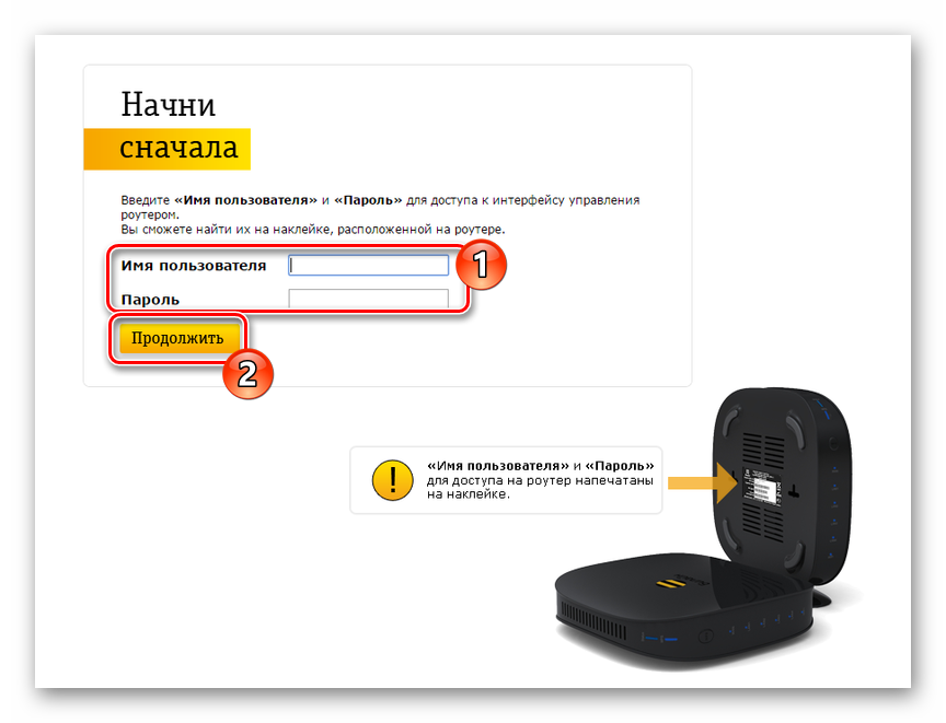 Войдя в конфигуратор первый раз, вы увидите окно приветствия. Нажмите кнопку «Продолжить», и перед вами откроется новое окно, в котором нужно будет ввести логин и пароль. По умолчанию у всех абонентов Билайн это admin/admin.