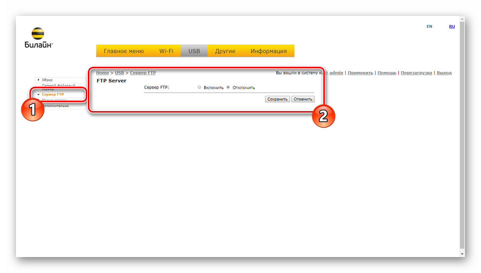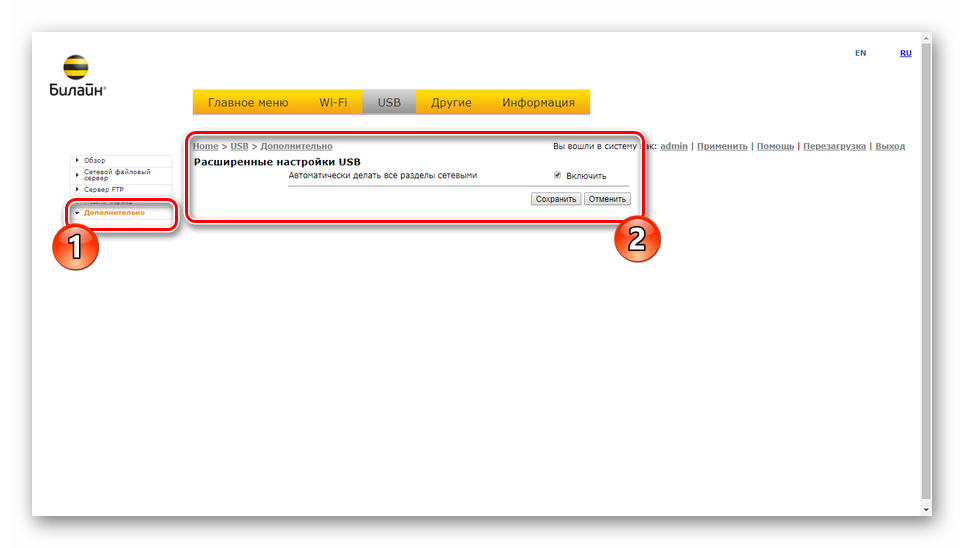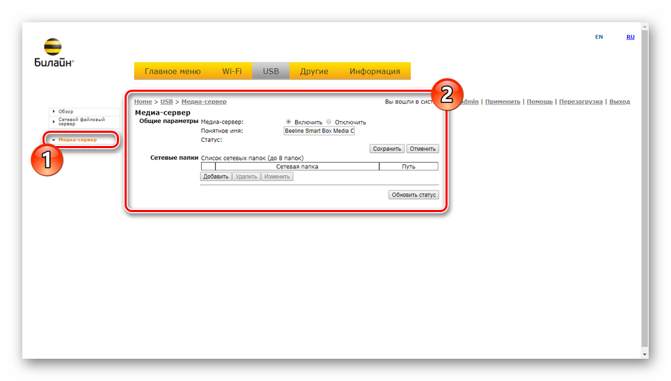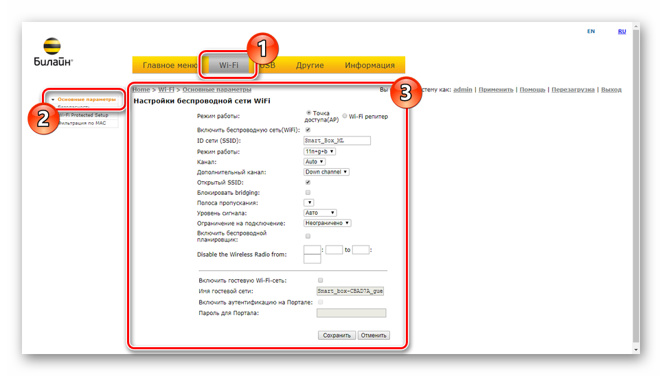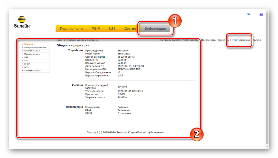 Вводим логин admin, пароль admin и попадаем в стартовое меню настройки Smart Box от Билайн.