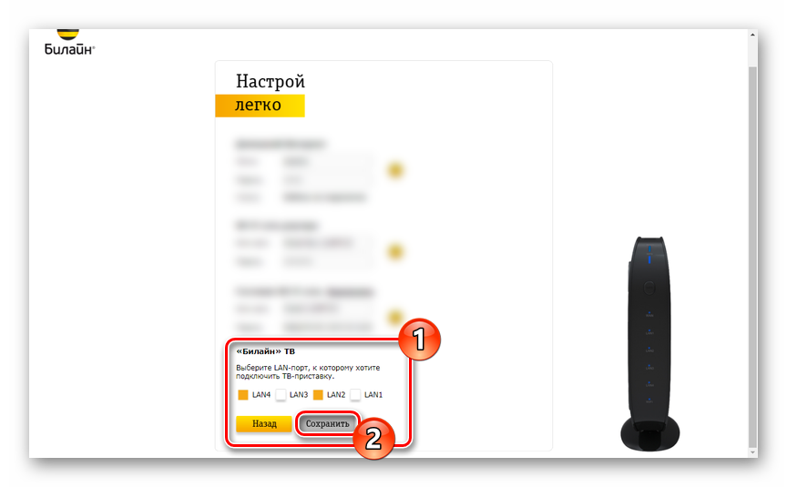 Если Вы подключили ещё и телевидение Билайн, то в самом нижнем разделе меню, называемом «Билайн ТВ» надо отметить тот LAN-порт, в который будет включена приставка. Нажимаем на кнопку «Сохранить».