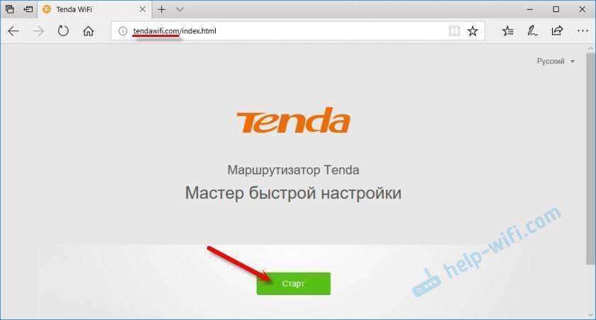 Откроется мастер быстрой настройки. Интерфейс его максимально упрощён по сравнению с другими моделями. Видимо, это сделано в обновленной заводской прошивке для удобства использования на мобильных устройствах. Веб-интерфейс открывается сразу на русском языке, но в прошивке имеется большинство самых распространенных, можно выбрать, например, украинский. Для продолжения настройки роутера Тенда жмем на кнопку «Старт»
