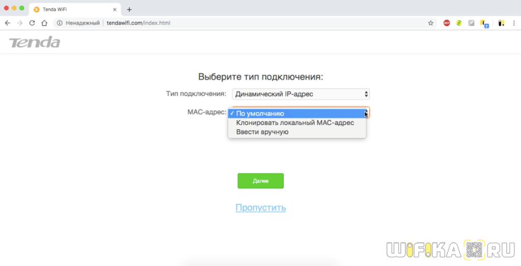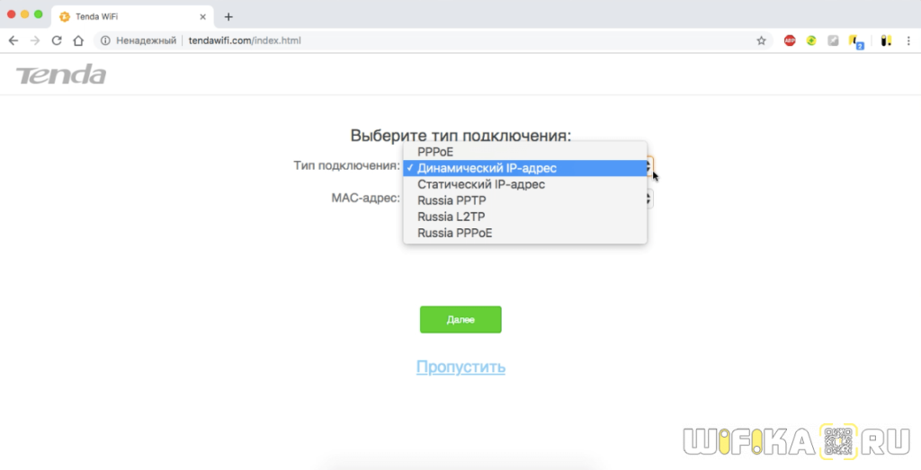 После того, как компьютер подсоединен к роутеру кабелем или по Wi-Fi, откройте браузер и в адресной строке введите 192.168.0.1 или http://tendawifi.com. Откроется окно с мастером быстрой настройки. В нем укажите вид подключения. Обычно это динамический IP, реже встречается PPPoE. Во втором случае потребуется ввести логин и пароль, предоставленные провайдером.
