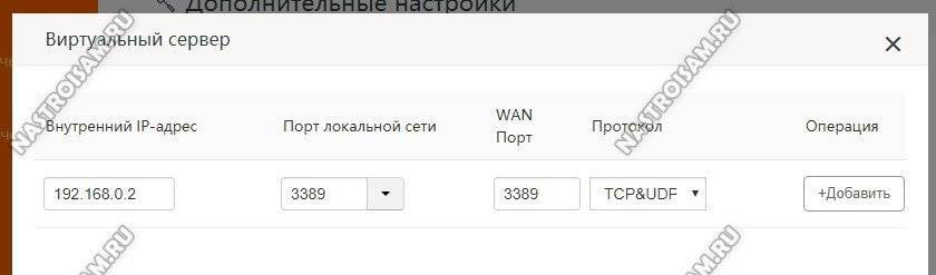 Тут Вам нужно прописать IP-адрес, для которого надо открыть порт на Тенде и указать номер этого порта для локальной сети и для WAN. Остаётся только указать используемый протокол (оптимальнее выбирать значение TCP&UDP) и нажать на кнопку «Добавить», чтобы правило добавилось в список.