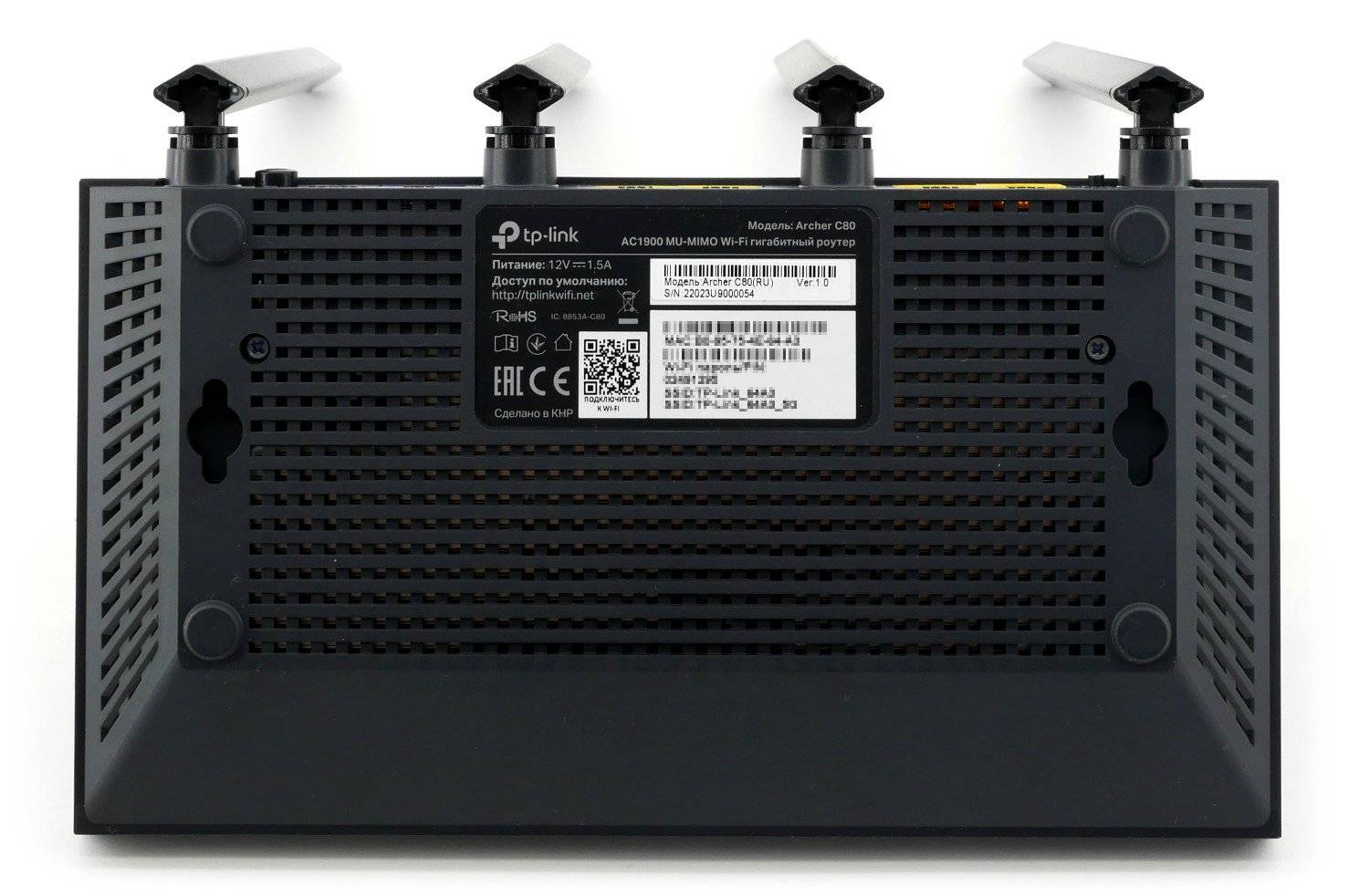 Корпус TP-Link Archer C80 изготовлен из шероховатого матового пластика, посередине проходят две параллельные линии с глянцевым отблеском. Несомненно, для придания внешнего облика. Четыре антенны несъемные, производитель не указывает их мощность, но приводит коэффициент усиления 5 дБи.