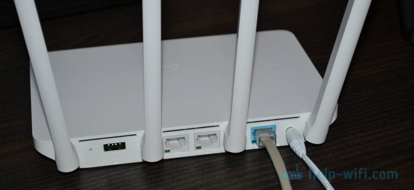Давайте сразу к делу – подключаем роутер. Нам нужно подключить только блок питания и включить его в розетку. В порт WAN (он выделен голубым цветом) подключаем интернет. Имеется введу сетевой кабель от провайдера, или от ADSL модемы. Если у вас есть компьютер или ноутбук с LAN-портом и сетевой кабель (которого в комплекте с роутерами Xiaomi нет) , то можете подключить ПК/ноутбук по кабелю. Хотя бы для настройки, потом сможете отключить. У меня получилось вот так: