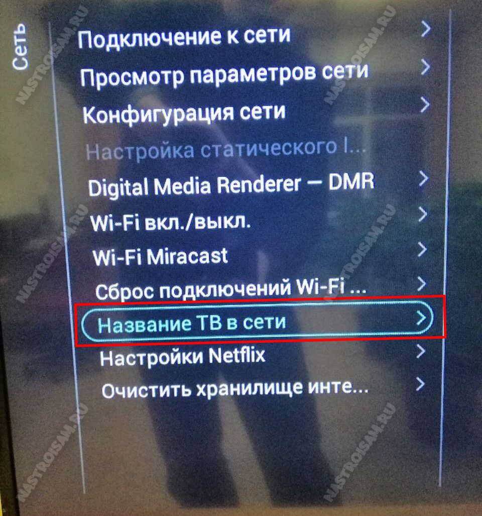 Так же я бы посоветовал изменить имя телевизора в сети, чтобы можно было легко найти его в списке беспроводных клиентов роутера. Для этого надо зайти в раздел «Название ТВ в сети»: