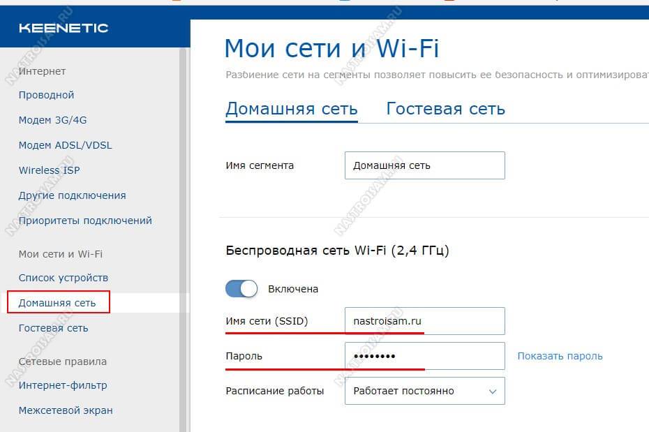 Чтобы роутер мог раздавать беспроводной интернет, необходимо активировать и настроить точку доступа. Делается это на вкладке «Сеть Wi-Fi». Она имеет 5 разделов, наиболее полезны 3 из них: