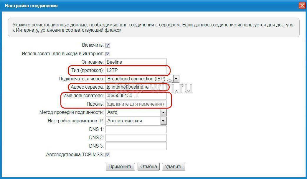 - в строке «Адрес сервера» указываем «tp.internet.beeline.ru;