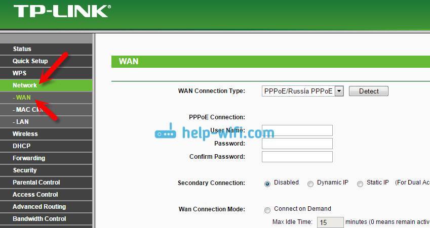 На Tp-Link параметры провайдера задаются на вкладке Network – WAN. Зайти в настройки можете по этой инструкции. В поле WAN Connection Type выберите нужный тип соединения, и задайте необходимые параметры (они зависят от выбранного соединения), которые предоставляет провайдер.