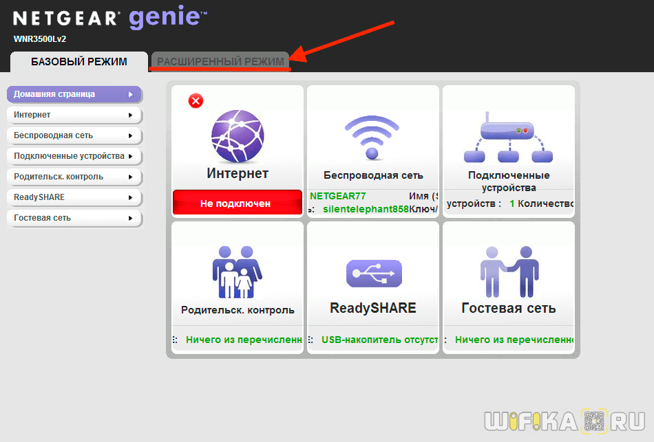 Попадаем в панель администратора Netgear. Как видим, под значком «Интернет» красный цвет, который означает, что в данный момент подключение не активно. Можно воспользоваться функцией быстрой настройки роутера, но чтобы контролировать весь процесс подключения, рекомендую сразу перейти в «Расширенный режим»