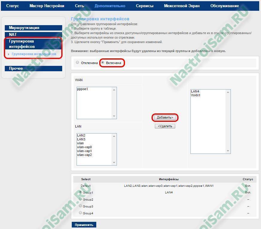 В списке групп выбираем Group1. И добавляем в поле справа интерфейсы из полей слева. Из верхнего поля добавим бриджевое содеинение, которое у меня называется WAN1, а из нижнего — 4й LAN-порт. Именно в этот порт Вам надо будет включить STB-приставку Ростелеком. Кликаем на кнопку применить.