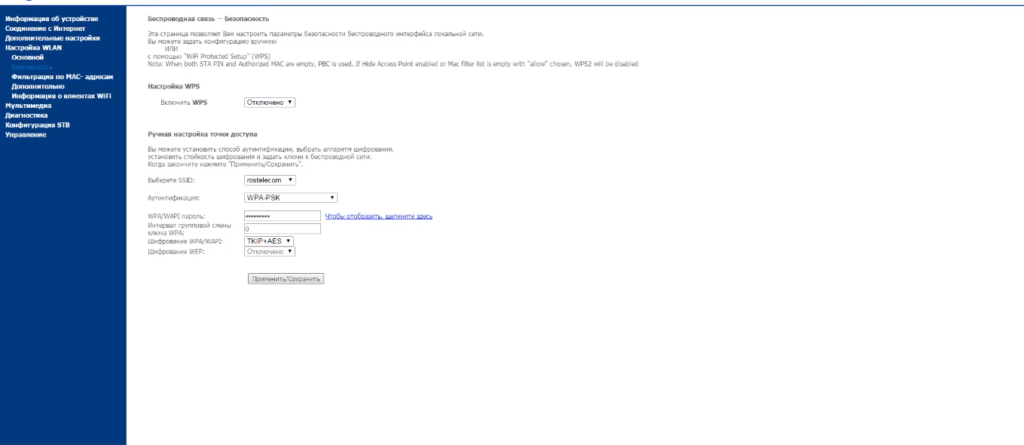 Здесь надо в поле Тип SSID поставить флажок «Основная». Тип шифрования ставим «WPA2 Mixed». Режим работы WPA — «Персональный (Общий ключ)» с форматом «Ключевая фраза». Остаётся только в поле «Общий ключ» ввести пароль на WiFi. В этом качестве можно использовать любую последовательность цифр или букв латинского алфавита не короче 8 символов. Применяем настройки.