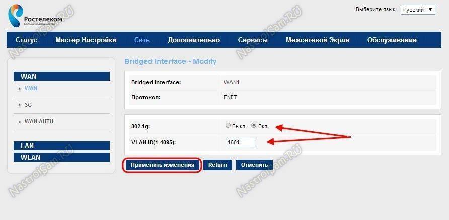 Ставим флажок 802.1q — ВКЛ., а в поле VLAN ID прописываем идентификатор для Вашего подъездного коммутатора. Узнать его надо в технической поддержке Ростелеком. В моём случае — это 1601.